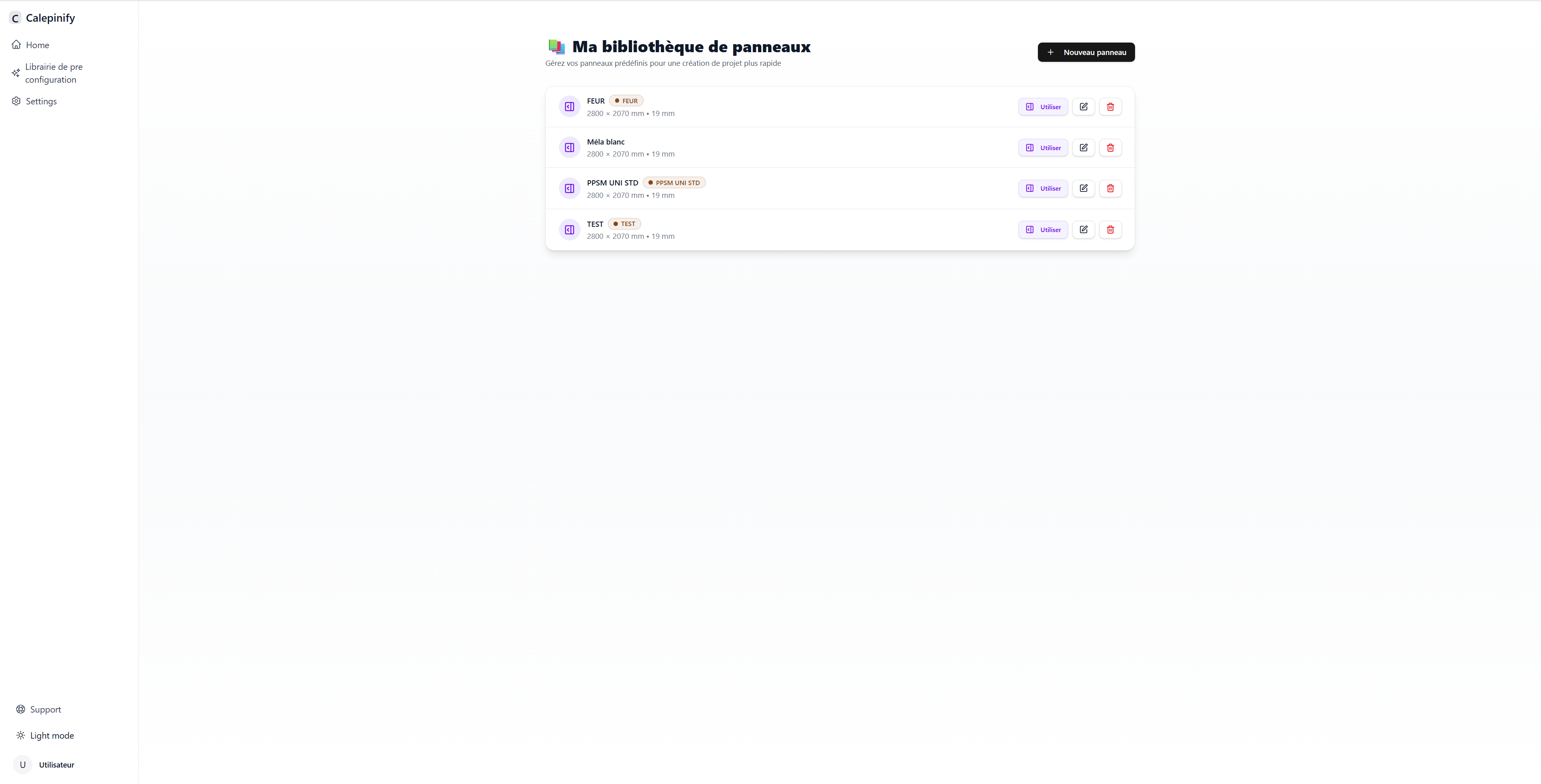 Bibliothèque de panneaux standards : Les utilisateurs peuvent sauvegarder leurs panneaux habituels (2800×2070mm, 2500×1250mm, etc.) pour les réutiliser en un clic dans tous leurs projets.