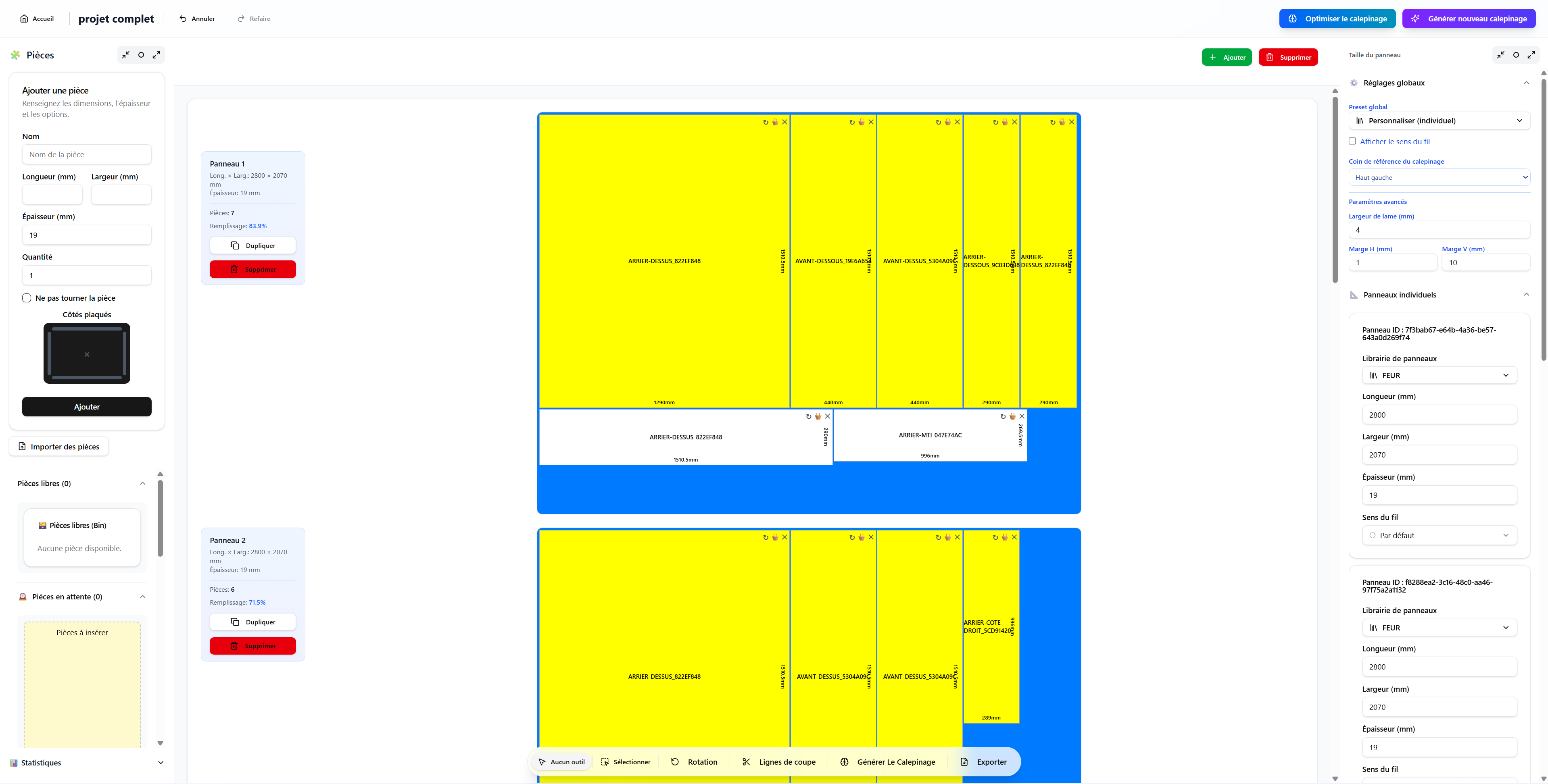 ✅ Gestion automatique des contraintes : jeu de scie, marges, sens du fil pris en compte automatiquement