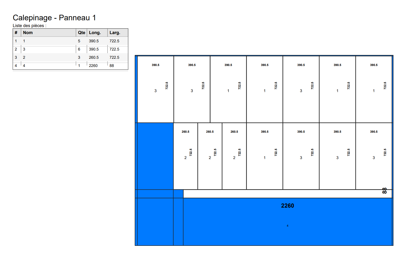 - Un tableau récapitulatif avec le nom, la quantité, la largeur et la hauteur de chaque pièce